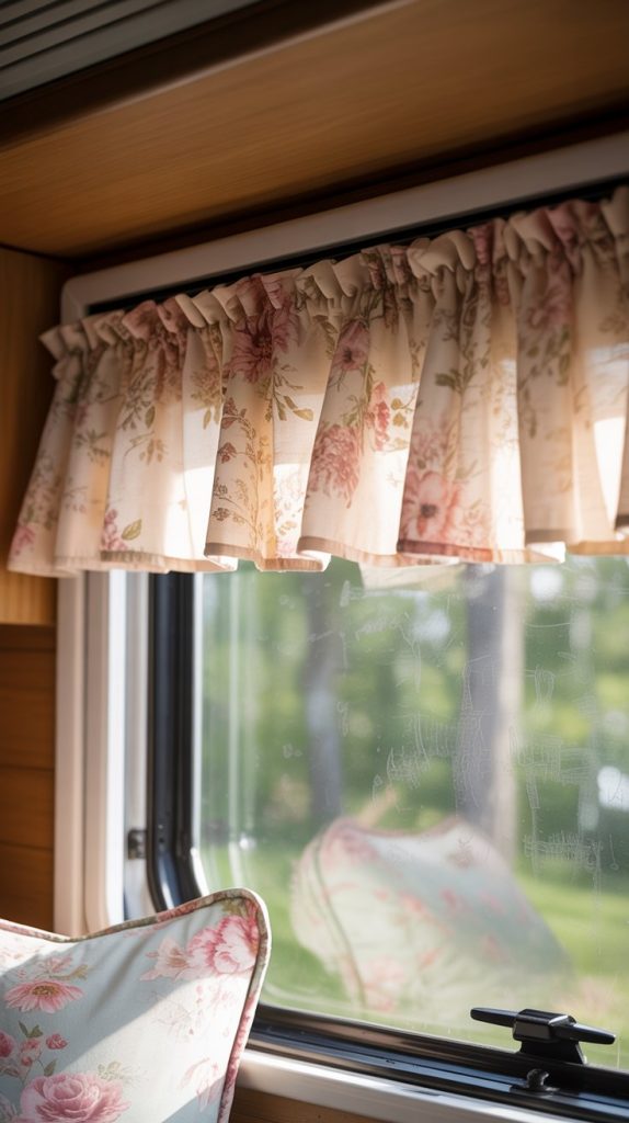 Window treatments are a game-changer in a small space, and valances are the perfect choice for RVs as they don’t interfere with the operation of blinds or windows. Choose valances made from a vintage-inspired floral fabric with a soft color palette of muted roses, sage greens, and creamy ivories. This instantly softens the hard lines of the windows and adds a layer of textile beauty that is central to the shabby chic style.