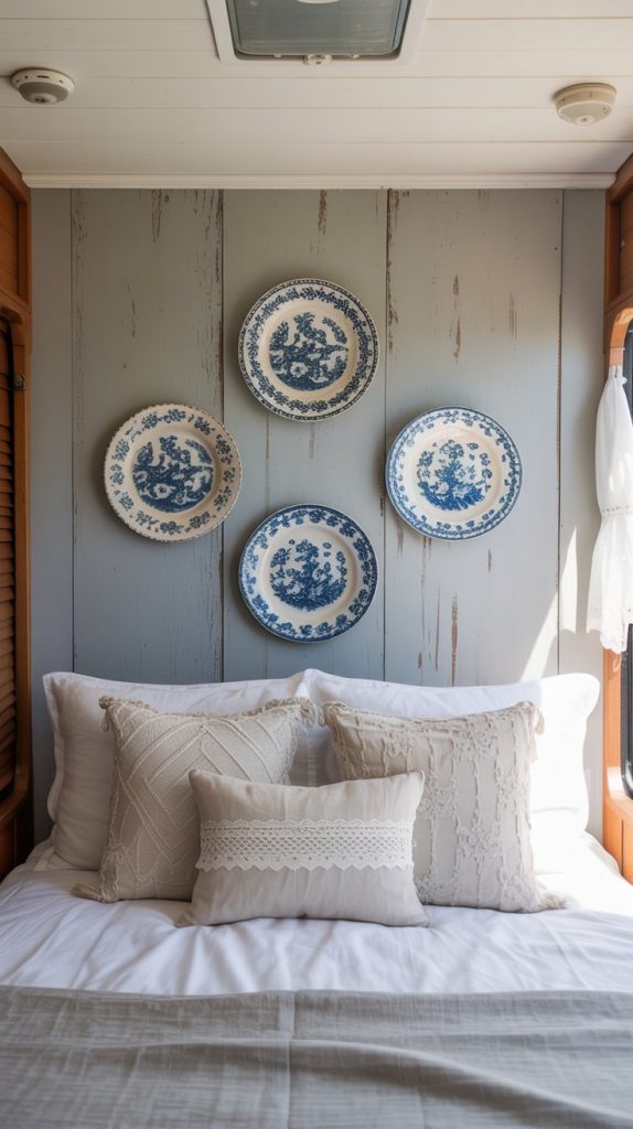 This is an inexpensive way to add large-scale art to your walls. Arrange them in a simple grouping above your dinette or bed. Plate hangers are easy to use and secure, ensuring your beautiful dishes stay safely on the wall as you travel.