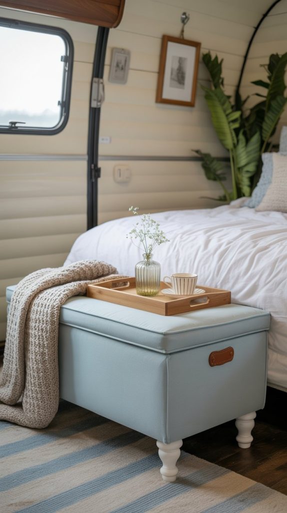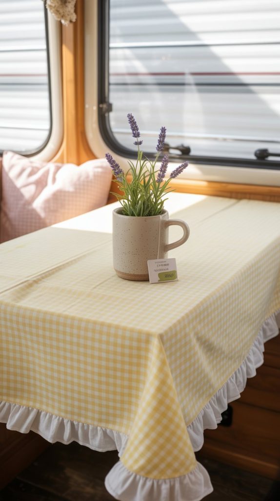 A tablecloth instantly disguises a standard RV table and makes mealtimes feel more special. It’s also practical, protecting the surface from spills and scratches. When not in use, the soft fabric folds away easily, or you can style it loosely draped for a more relaxed, “lived-in” look.