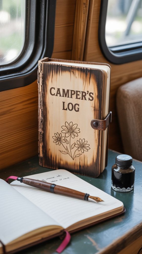The act of writing in a beautiful book feels more special and timeless than typing on a phone. The wooden cover, perhaps with a burned-in title or a leather strap, adds to the rustic, nostalgic atmosphere of your camper’s interior.