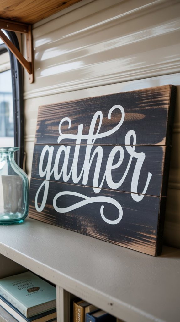 A wooden sign with a meaningful word or phrase adds a personalized touch to your decor. Choose a sign with a word like “Gather,” “Welcome,” or “Adventure Awaits” painted in a elegant script on a distressed wood background. It instantly establishes the mood and intention of your rolling home.