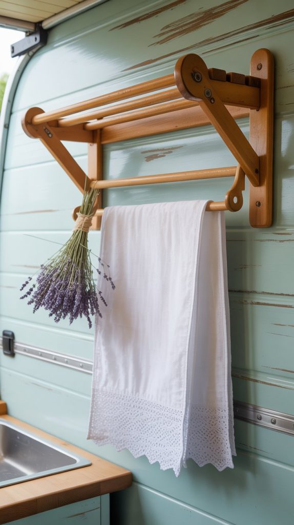 The natural wood and simple design add an authentic, practical charm to your kitchen or bathroom. Watching your herbs dry or seeing your pretty linens fluttering slightly adds a living, dynamic element to your camper that feels wholesome and connected to a simpler way of life.