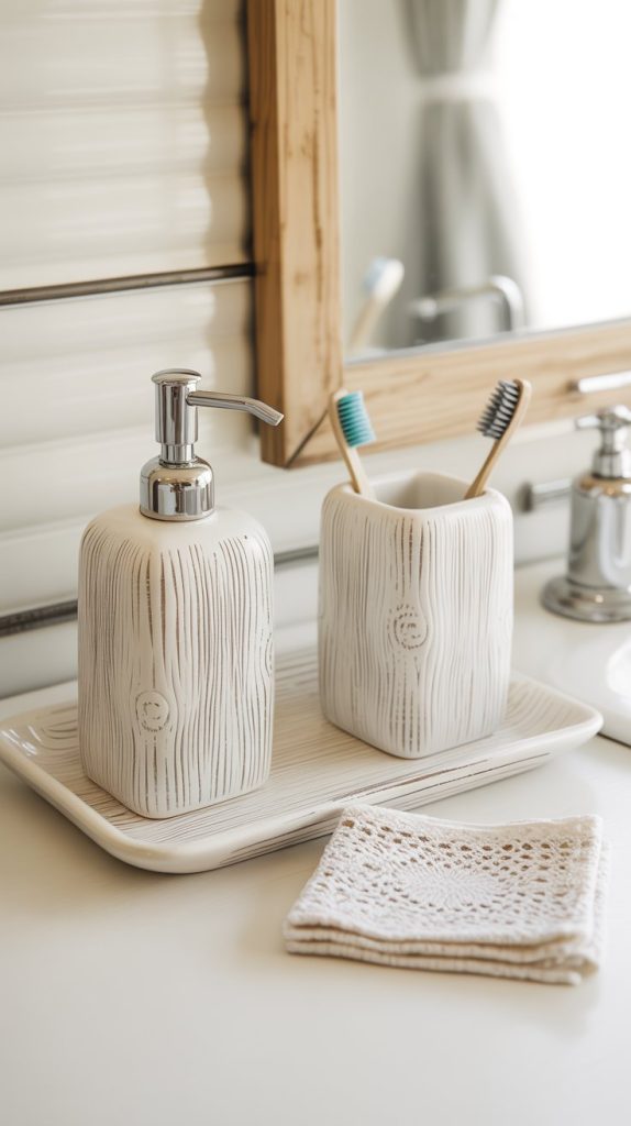 Bring the rustic appeal of wood grain into your camper’s bathroom without the weight or maintenance concerns of real wood. A Faux Bois ceramic vanity set, including a soap dispenser, toothbrush holder, and a tray, features beautifully realistic wood-grain texture glazed in a soft white or cream color. This set keeps your countertop organized while perfectly marrying the rustic and elegant sides of the shabby chic aesthetic.