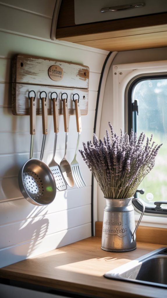 PRO TIP: For a lovely scent, hang small bunches of lavender or eucalyptus to dry on the rack. As they dry, they will naturally perfume your camper with a gentle, calming aroma.