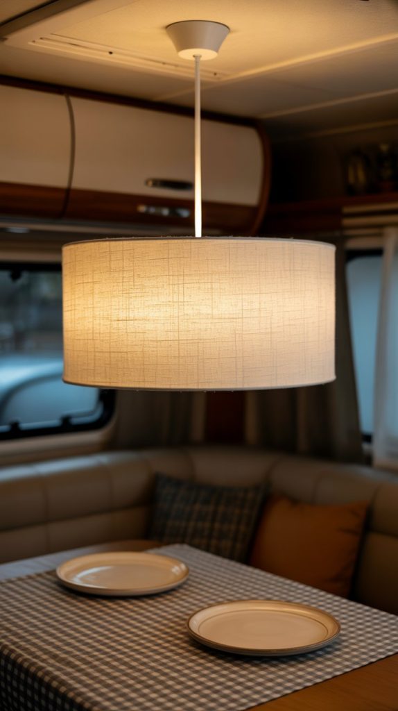 Swap out a generic RV light fixture for a soft, diffused linen hanging pendant light. The natural fabric shade casts a gentle, warm glow that eliminates harsh shadows and creates an inviting atmosphere. A simple drum or bell-shaped shade in a neutral linen color fits the shabby chic aesthetic perfectly.