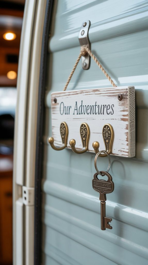 Your shabby chic camper isn’t just for the road—it’s your key to adventure. A vintage key rack provides a designated spot for your camper keys, car keys, and perhaps a key to a special lockbox. Choose one made from distressed wood with ornate metal hooks and a charming phrase like “Our Camper” or “The Keys to Our Adventures.”