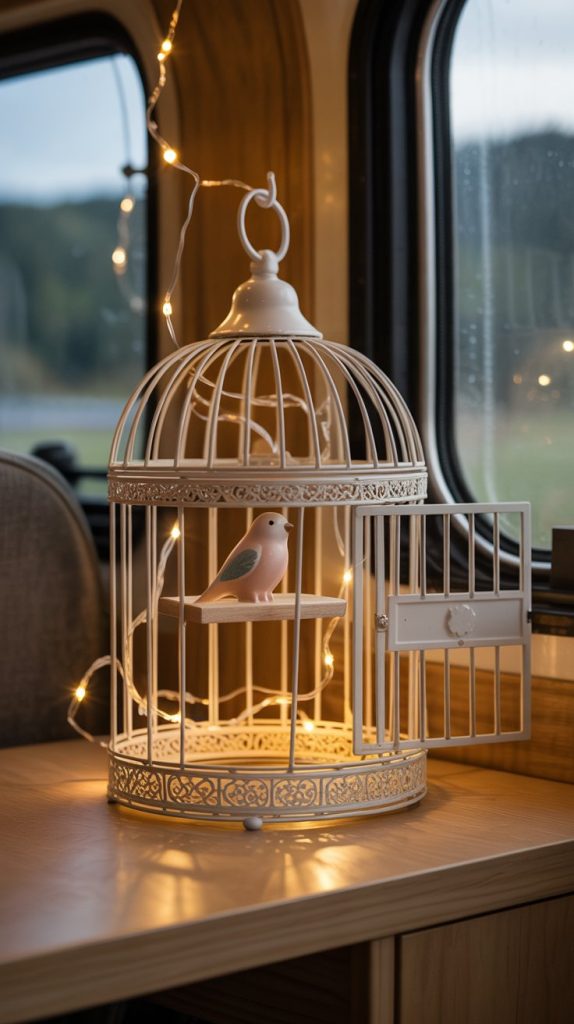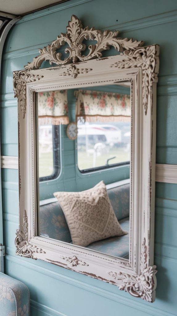 A strategically placed mirror is a secret weapon for making a small camper interior feel larger and brighter. Choose an ornate, distressed wall mirror with curlicues and scrollwork, finished in chippy white or gold paint. It acts as a stunning piece of art while reflecting light and the view from your windows, effectively doubling the sense of space.