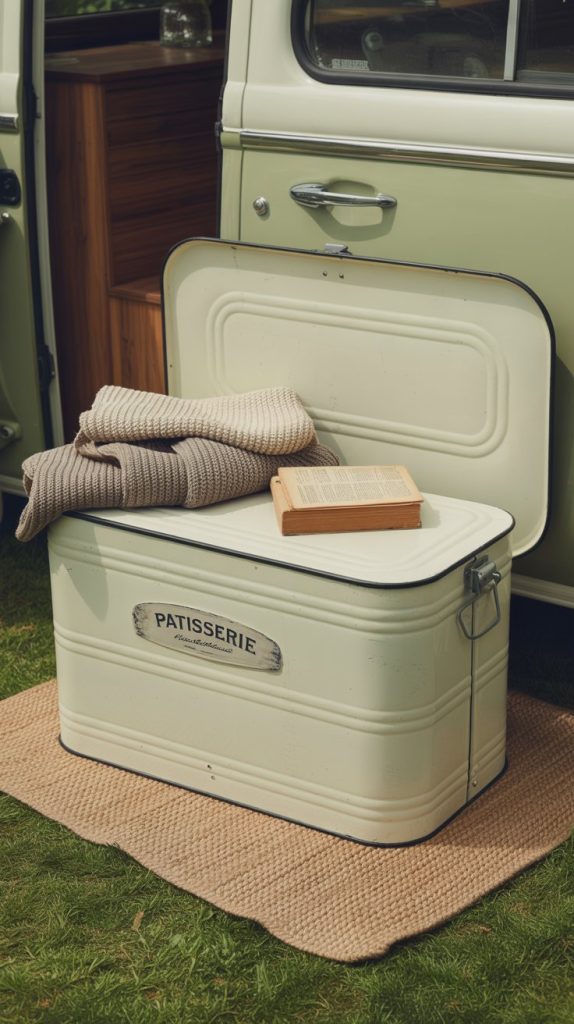 Every shabby chic camper needs stylish, hidden storage for odds and ends. A vintage-style metal tonneau bin, with its rectangular shape and hinged lid, is both practical and picturesque. Often adorned with French labels or a chippy paint finish, these bins are perfect for storing extra throw blankets, magazines, board games, or even dry pantry goods.