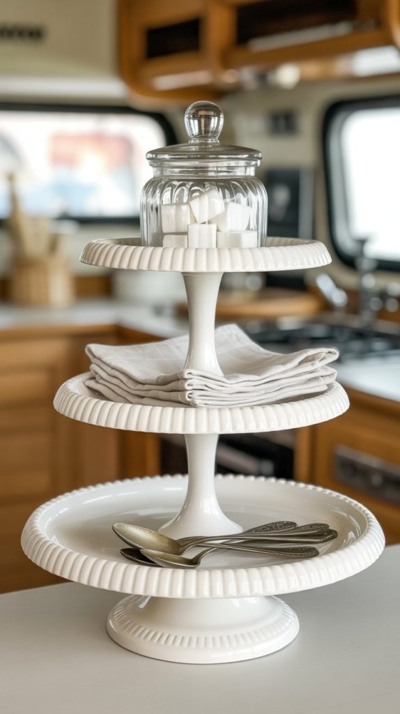 Maximize your vertical counter space with a tiered, ruffled cake stand. This isn’t just for desserts; it’s a brilliant organizer for your kitchen or dining area. Use it to display pretty mugs, hold napkins and condiments, or showcase a collection of vintage milk glass or ceramic canisters.