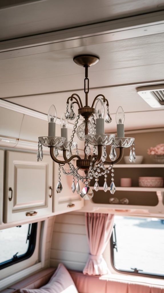 Elevate your camper’s ambiance to a new level of glamour with a mini crystal chandelier. Replacing a standard, harsh dome light with a small, multi-arm chandelier introduces dazzling refraction and a focal point of elegance. The interplay of light and crystal creates a romantic, sparkling effect that is the epitome of “chic” in shabby chic.