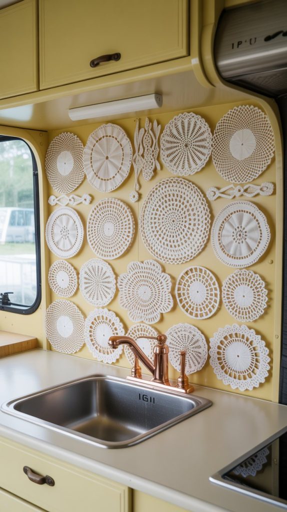 Create a temporary and utterly charming backsplash using crocheted doilies. This is a fantastic, non-permanent way to add intricate texture and pattern to your kitchen or bathroom wall. You can use a collection of vintage doilies in various sizes or new ones for a uniform look.