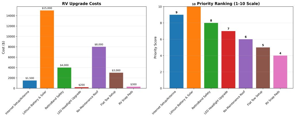 Start with the LED headlights and RV Snap Pads for immediate gratification, then work your way up to the bigger investments. Your future self will thank you when you’re enjoying your coffee in the morning instead of troubleshooting problems that could have been prevented.