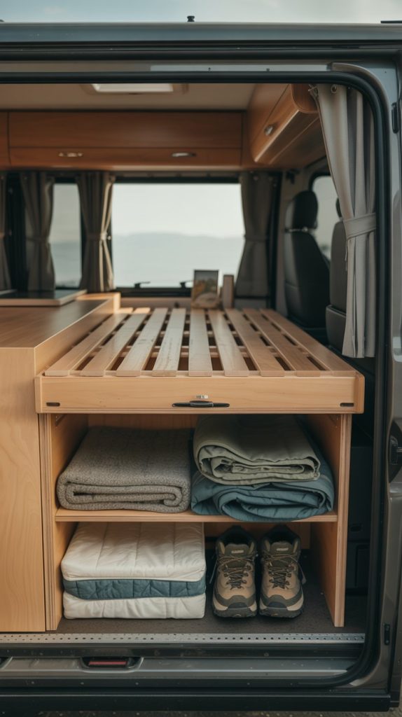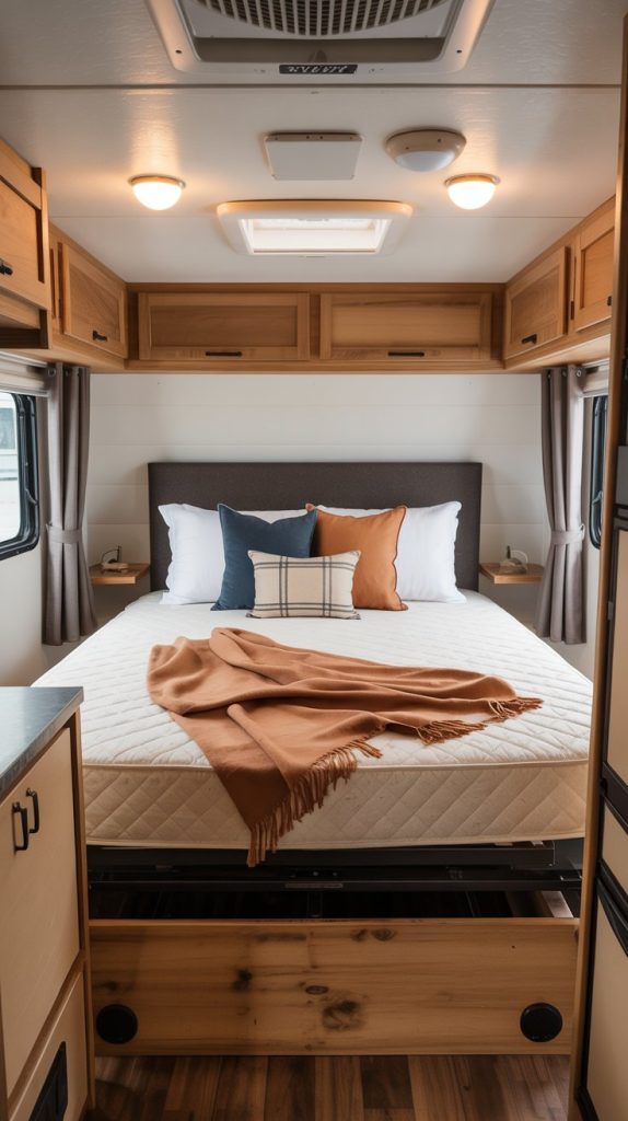 Most RV beds are mounted on a solid platform, wasting a massive amount of potential storage space below. Building a custom, slatted platform lifts the bed just enough to create large, accessible drawers or cubbies underneath. This is a game-changer for storing bulky items like bedding, off-season clothing, shoes, or outdoor equipment.
