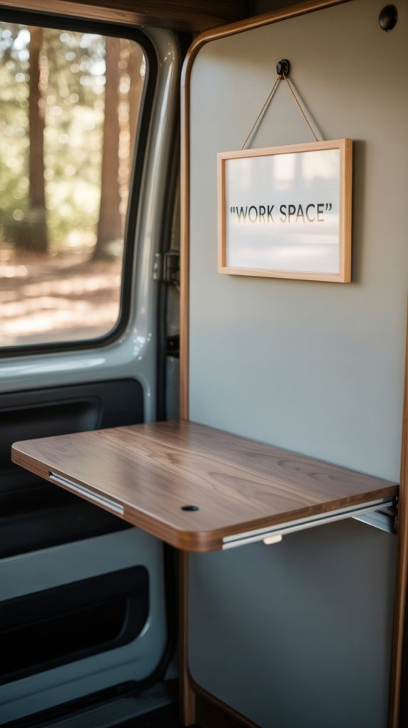 Mount it at desk height next to a chair to create a laptop workstation, or install it at a lower height to serve as a child’s art table. You can even add a small lip or ledge on the sides to prevent items from sliding off when the vehicle is parked. This multifunctional piece is all about maximizing utility in a minimalist way.
