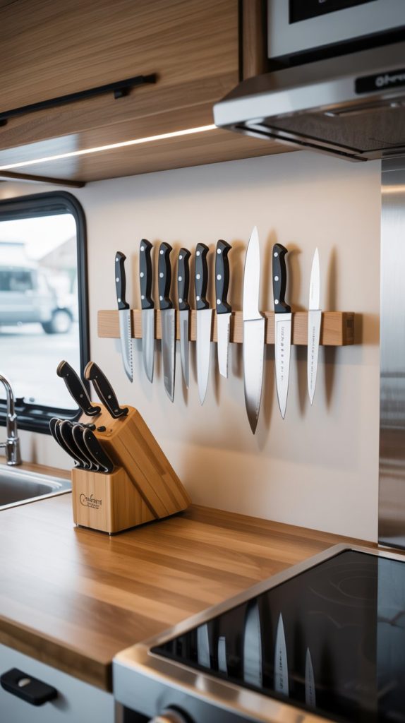 Counter space is a precious commodity in any RV. Free up a large block of it by ditching the bulky knife block and installing a magnetic knife strip on the wall. This is a brilliantly simple and inexpensive solution that keeps your knives organized, easily accessible, and adds a sleek, chef-like touch to your kitchen decor. You can find magnetic strips in various finishes like wood, stainless steel, or even paintable options to match your theme.