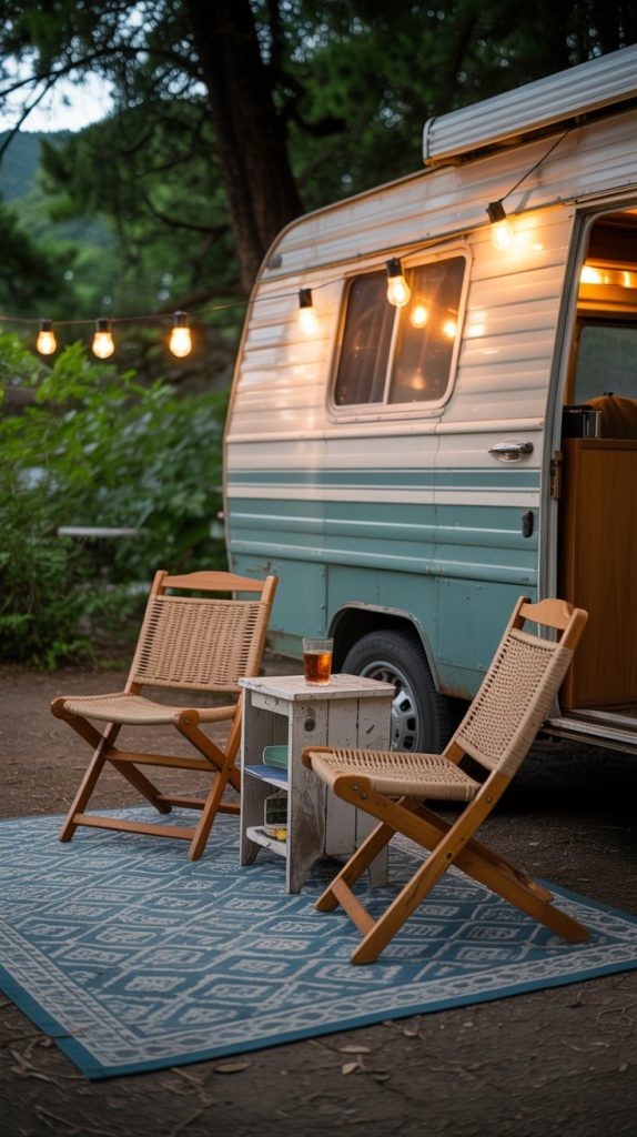 Your old RV remodel shouldn’t stop at the door! Extend your living space by creating a cozy outdoor “room.” An outdoor rug instantly defines the area. Add compact folding chairs, a small side table, and string up patio lights or solar-powered lanterns for evening ambiance.