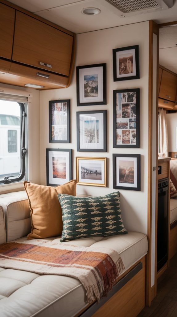 Personalize your old RV space and celebrate your adventures with a mini gallery wall. Instead of one large piece of art, create a curated collection of small prints, postcards, and photos from your travels. Use cohesive frames (like all black, all white, or all natural wood) or mix and match for an eclectic look.