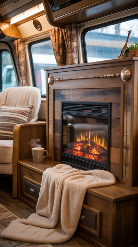 Create the ultimate cozy vibe with a faux fireplace in your old RV. You can build a simple surround using painted wood or even an old entertainment center cabinet. Then, install an electric fireplace insert. These inserts plug into a standard outlet, provide supplemental heat, and have realistic flame effects without any real fire or mess.