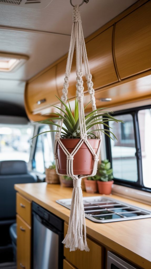 Bring life and boho texture into your old RV with air plants or low-light succulents. Hanging them in macrame planters saves valuable counter and table space and adds visual interest at eye level. The natural fibers of the macrame complement the organic feel of the plants and soften the hard surfaces of the RV interior.