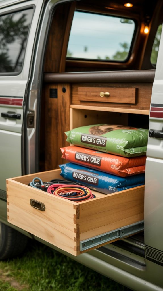 If you travel with furry friends in your old RV, their food and supplies can create a lot of clutter. Convert a lower cabinet into a dedicated, slide-out storage space for pet bowls, food, and leashes. You can build a simple wooden box on heavy-duty drawer slides or even repurpose a old wooden drawer that fits the space.