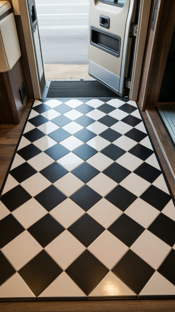 Protect your new floors and define your entryway with a “tile rug.” Using peel-and-stick vinyl floor tiles in a contrasting pattern, create a custom-sized rug right on your old RV floor. A classic black and white checkerboard pattern is timeless and hides dirt well between cleanings. The best part? It’s completely removable and leaves no residue.