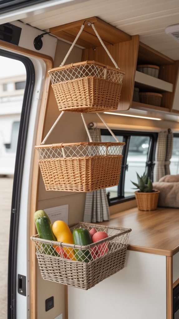 Wall and ceiling space is valuable real estate in an RV that often goes unused. Hanging baskets are a beautiful and functional way to add storage without taking up floor or counter space. Wicker or woven seagrass baskets add natural texture and a boho-chic vibe, while metal mesh baskets offer a more industrial feel. They are perfect for storing fruits and vegetables, remotes, knitting supplies, or even bathroom toiletries.