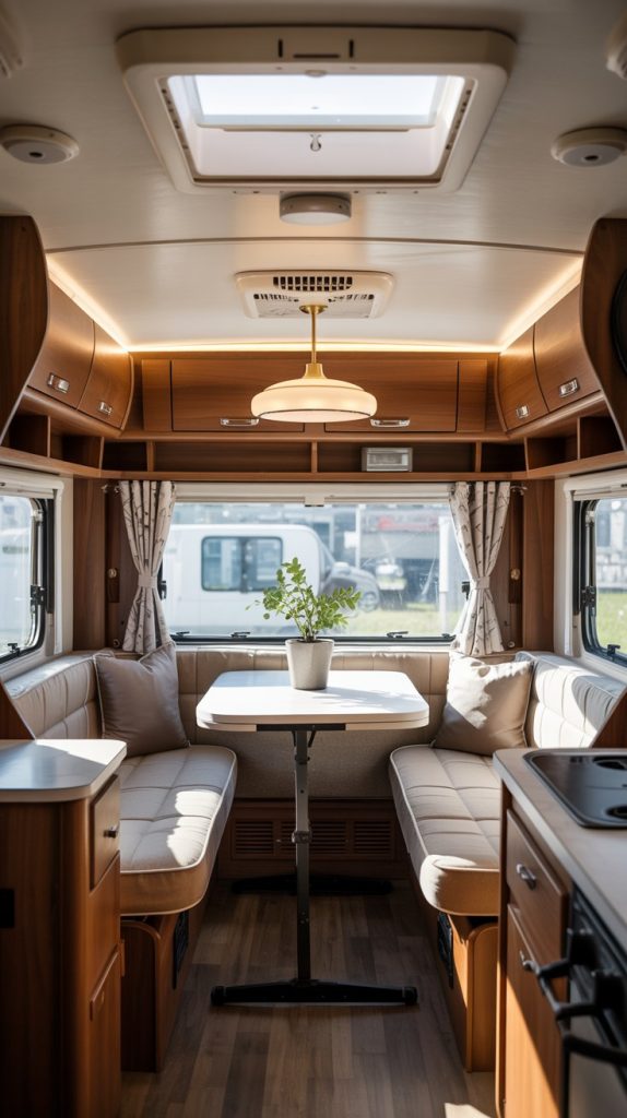 The dated, fluorescent box lights and dim brass fixtures in old RVs can cast a harsh, unflattering light and severely detract from your new decor. Swapping them out is usually a very simple electrical project that makes a huge difference. Look for modern LED fixtures that are not only stylish but also energy-efficient and cooler-running. Consider installing a statement fixture over the dinette, like a small modern chandelier or a sleek dome light, to create a designated “dining area.”