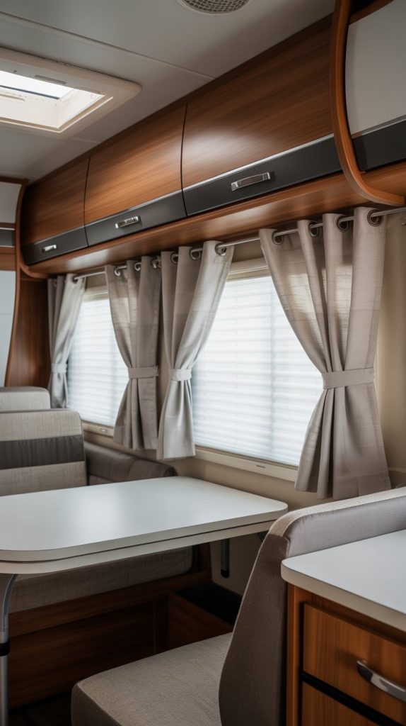 Ditch the heavy, dark valances that block precious natural light. Replacing window treatments is one of the fastest ways to modernize your RV’s interior. Sewing simple, light-filtering curtains from modern fabric is an easy project. Best of all, you can hang them using tension rods, which require no drilling, screws, or permanent modifications—a perfect solution for renters or those who want to avoid damaging walls.