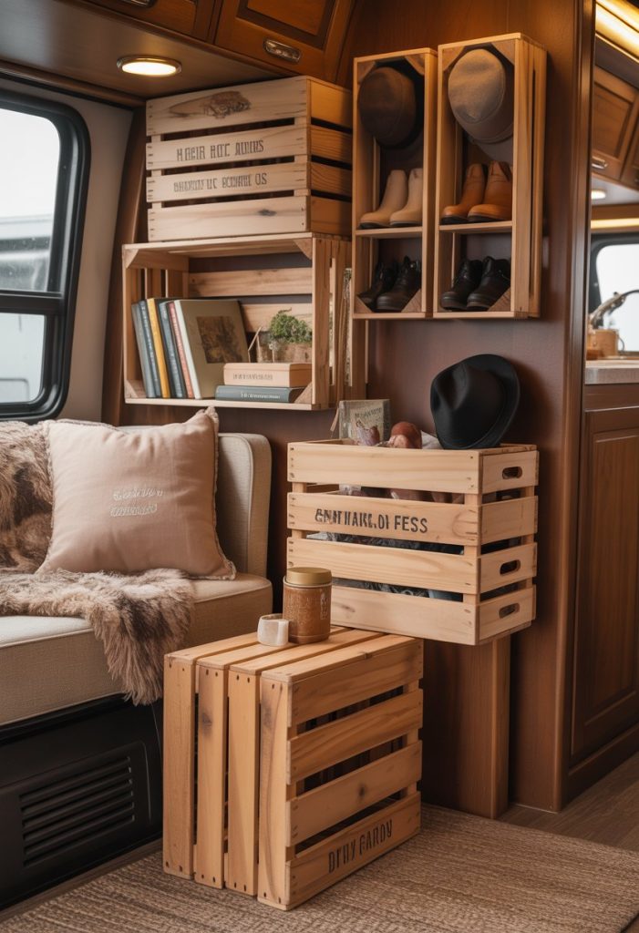 Wooden crates are the ultimate budget-friendly building block for RV storage. Sand them down and stain or paint them to match your decor. Stack them on their side to create a rustic bookshelf, mount them on the wall as cubbies for shoes and hats, or use a single crate as a stylish end table next to a chair.