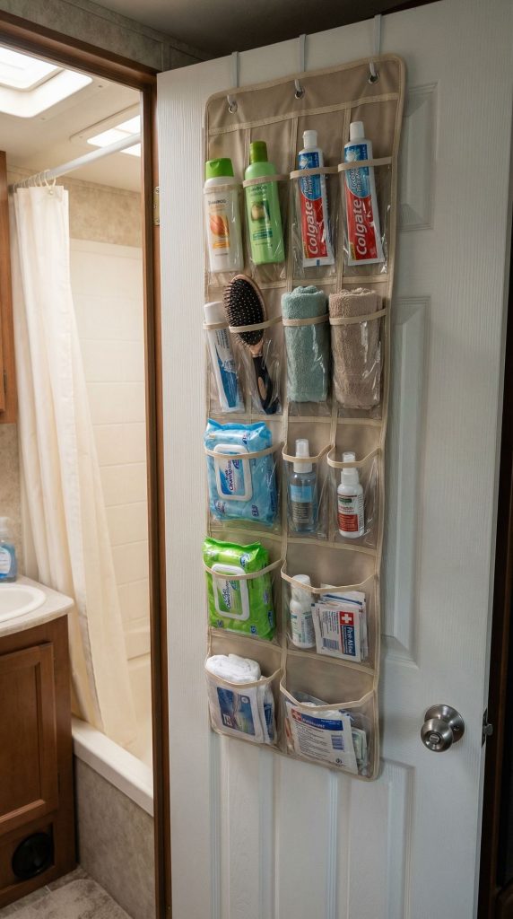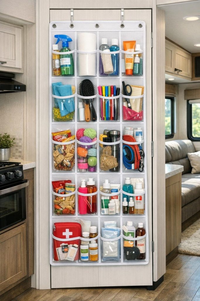 While designed for footwear, over-the-door shoe organizers are actually multipurpose storage powerhouses perfect for organizing countless RV items beyond just shoes. Use pockets to store cleaning supplies, toiletries, craft supplies, office materials, snacks, pet accessories, or first aid items—creating a vertical storage wall that would otherwise be wasted space. The clear pocket design makes finding items effortless.