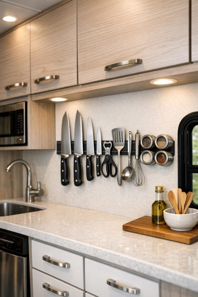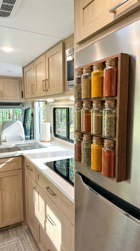 Transform your RV kitchen by mounting spices on magnetic strips, freeing up precious cabinet space while keeping seasonings within arm’s reach. Magnetic spice storage is perfect for the mobile lifestyle because spices stay firmly attached during travel, eliminating the frustrating cabinet avalanches that plague RV cooks. Install magnetic strips inside cabinet doors, on the side of your refrigerator, or on metal backsplashes to create a customized spice station that works with your cooking style.