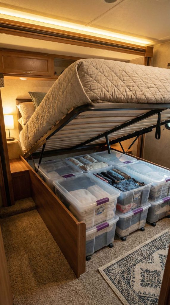 The space beneath your RV bed represents one of the largest untapped storage opportunities in your mobile home. Installing pull-out storage bins or drawers transforms this dead space into organized, easily accessible storage for seasonal clothing, extra bedding, camping gear, and bulky items you don’t need daily. Modern RV-specific under-bed storage systems feature smooth-gliding mechanisms and raised edges to prevent items from spilling during travel.