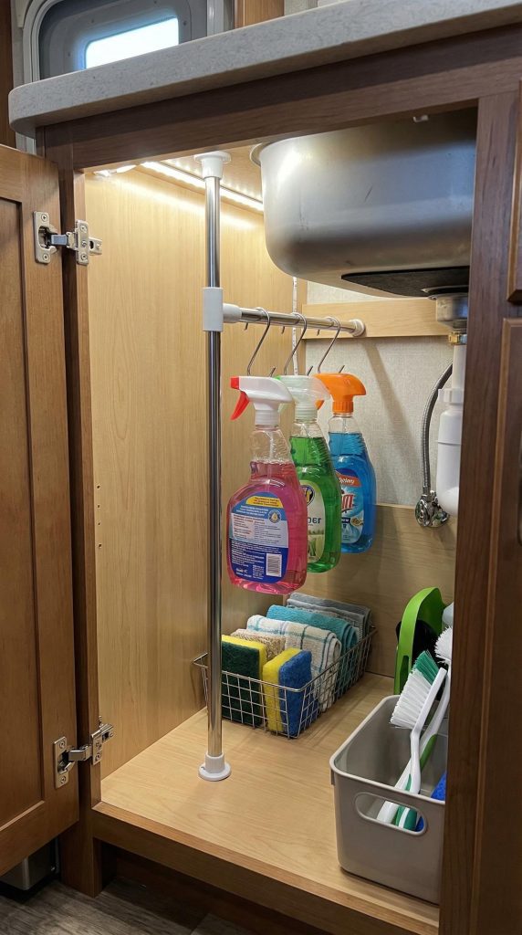 Tension rods are the unsung heroes of RV organization, providing instant storage solutions without drilling holes or permanent installation. In the bathroom, mount a tension rod under the sink to hang spray bottles, creating vertical storage in an awkward space typically wasted. Use them in closets to create double-hanging space for shorter items, in the shower for extra towel storage, or in kitchen cabinets to secure cutting boards and baking sheets vertically.