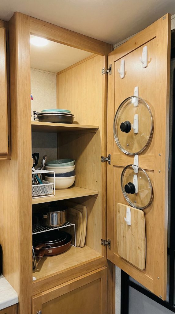 Transform your modern RV into an organized haven by installing over-the-door organizers that maximize every inch of vertical space. These versatile storage solutions work perfectly on bathroom doors for toiletries, bedroom doors for accessories, or pantry doors for snacks and spices. The clear pocket design lets you see contents at a glance while keeping everything securely in place during travel. Choose organizers specifically designed for RV use with reinforced hooks that won’t damage doors or shift when you’re on the move.