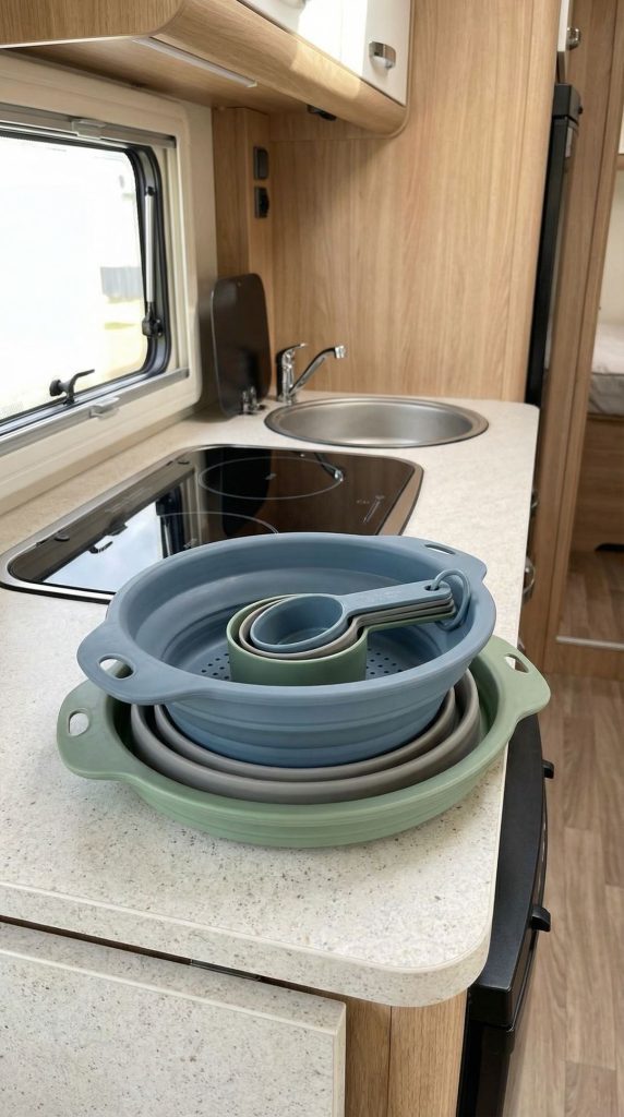 Collapsible silicone containers are absolute essentials for RV kitchens, solving the eternal problem of bulky food storage taking up valuable cabinet space. These innovative containers collapse flat when empty, reducing storage volume by up to 80% compared to traditional plastic containers. Use them for meal prep, leftover storage, and packing snacks for day trips—they’re microwave-safe, dishwasher-friendly, and far more durable than disposable options.