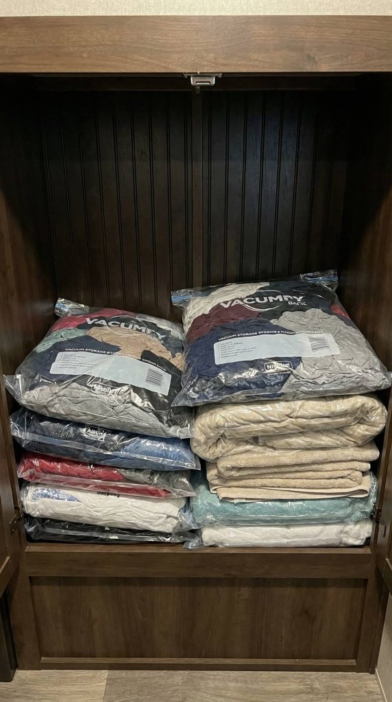 Vacuum storage bags compress bulky seasonal clothing, bedding, and linens to a fraction of their original volume, liberating massive amounts of precious RV storage space. These bags remove excess air, creating flat, stackable packages perfect for under-bed storage, overhead cabinets, or external storage compartments. The compression not only saves space but also protects items from moisture, dust, and odors during storage—critical in the variable conditions of RV living.