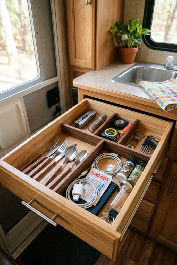 Drawer dividers transform chaotic junk drawers into organized, functional storage spaces that actually make sense for RV living. Adjustable bamboo or plastic dividers let you customize compartments to fit your specific items, from utensils and office supplies to cosmetics and tools. Install dividers in kitchen drawers for utensils and gadgets, bathroom drawers for toiletries, and bedroom drawers for accessories and small clothing items.