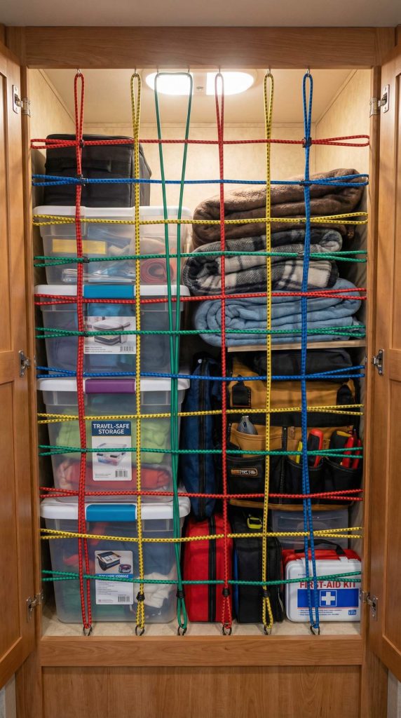 Bungee cords installed across open cabinet fronts create simple, effective retention systems that prevent dishes and containers from launching themselves onto your floor during travel. Install small screw-in cup hooks on cabinet frame sides, then stretch bungee cords across the opening to create a flexible barrier that holds items in place while still allowing easy access during stops. The elastic nature accommodates various item sizes and stacking heights.