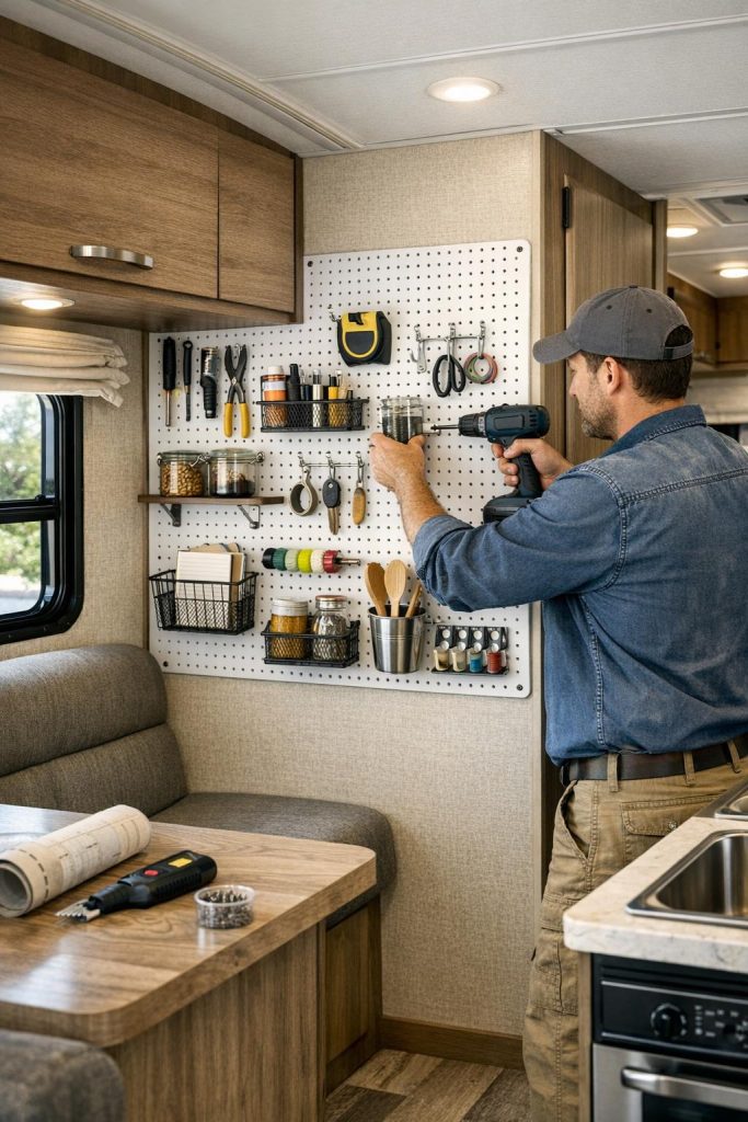 Secure pegboard firmly to walls using appropriate hardware for your RV’s wall construction. Plan your pegboard layout by tracing items on paper first, then arranging hooks and accessories to create the most efficient configuration before hanging anything. Paint pegboard to match your RV’s interior for a cohesive look.