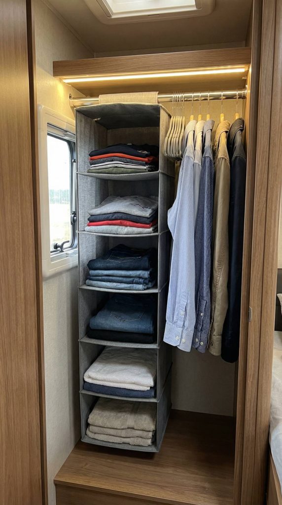 Hanging closet organizers with multiple shelves transform wasted vertical space in your RV wardrobes into practical storage for folded clothes, accessories, shoes, and linens. These soft-sided organizers hang from the closet rod, creating instant shelving without tools or permanent installation. Use them to create designated spaces for each family member’s belongings or organize by clothing type.
