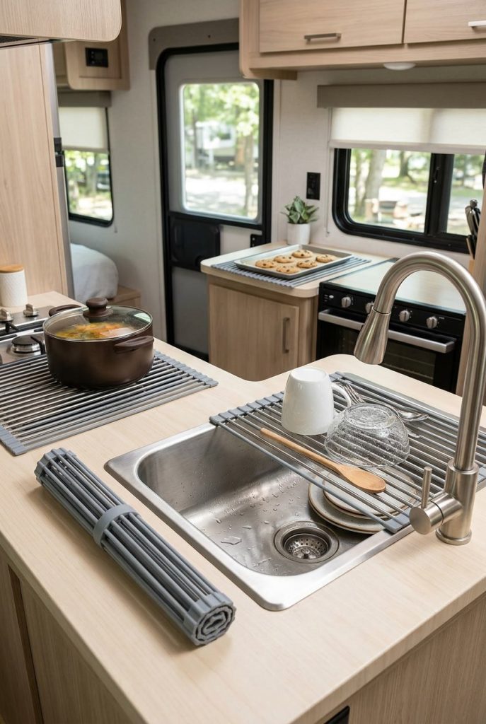 Roll-up dish drying racks made of silicone-coated steel create instant drying space over your sink, then roll up into a compact tube for storage when not in use. This brilliant solution addresses the RV kitchen dilemma of insufficient counter space for traditional dish racks. The flexible design conforms to most sink sizes and doubles as a trivet for hot pots or a cooling rack for baking.