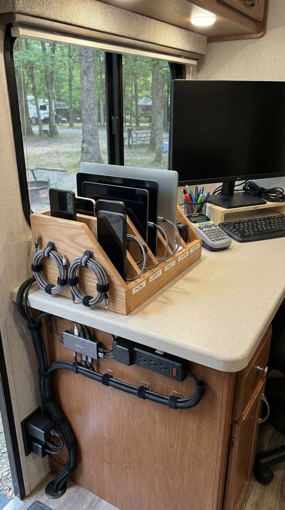 Taming the cable chaos in your RV prevents tangled messes and creates a neater, more organized living space. Use cable organizers, velcro ties, and labeled cable clips to create a dedicated tech station where every device has a designated charging spot. Mount cable clips along walls or inside cabinets to route cables neatly, preventing trip hazards and visual clutter.