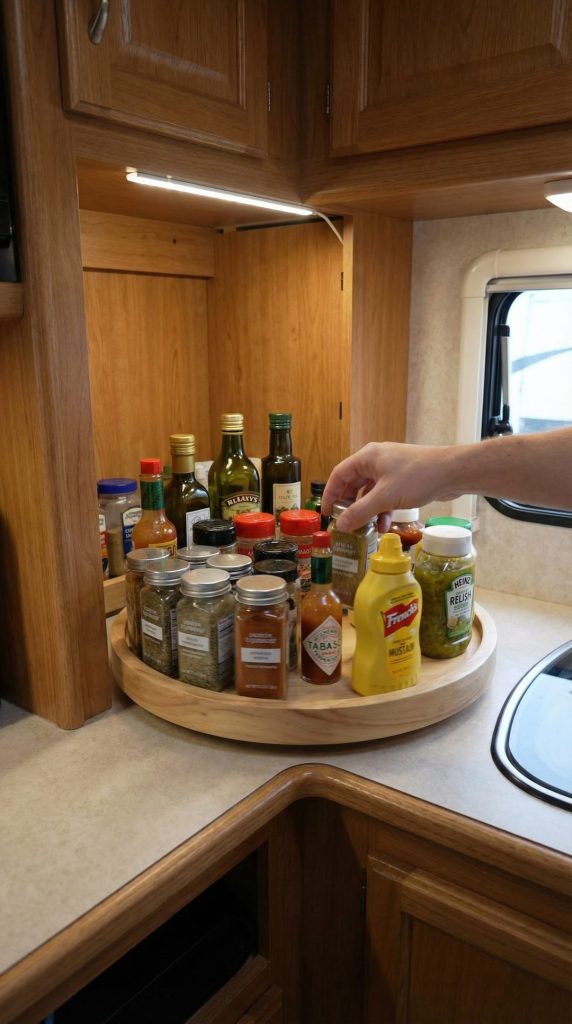 Lazy Susan turntables transform deep, difficult-to-reach corner cabinets and pantry shelves into accessible, efficient storage spaces in your RV. These rotating platforms bring items from the back to the front with a simple spin. Use them in kitchen cabinets for spices, oils, and sauces; in bathroom cabinets for toiletries; or in the refrigerator for condiments and small jars.