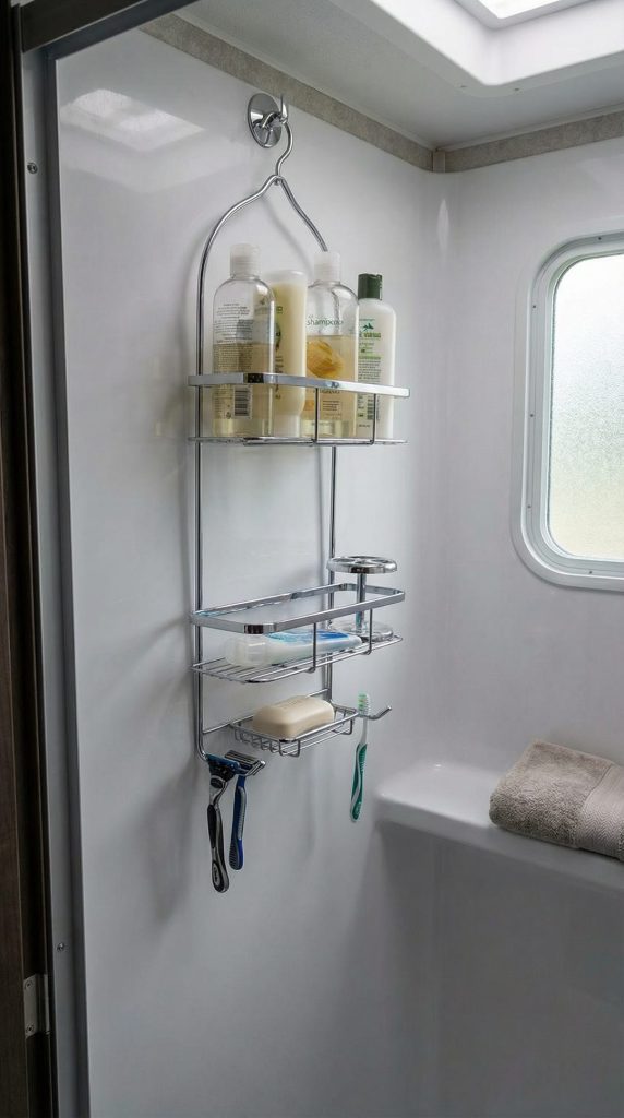 Hanging shower caddies with multiple tiers maximize vertical storage in your RV’s compact bathroom, keeping toiletries organized and accessible without cluttering shower shelves. These suspended organizers hang from the shower head or mounted hooks, utilizing otherwise wasted space. The open mesh design promotes water drainage and air circulation, preventing mildew and soap scum buildup.