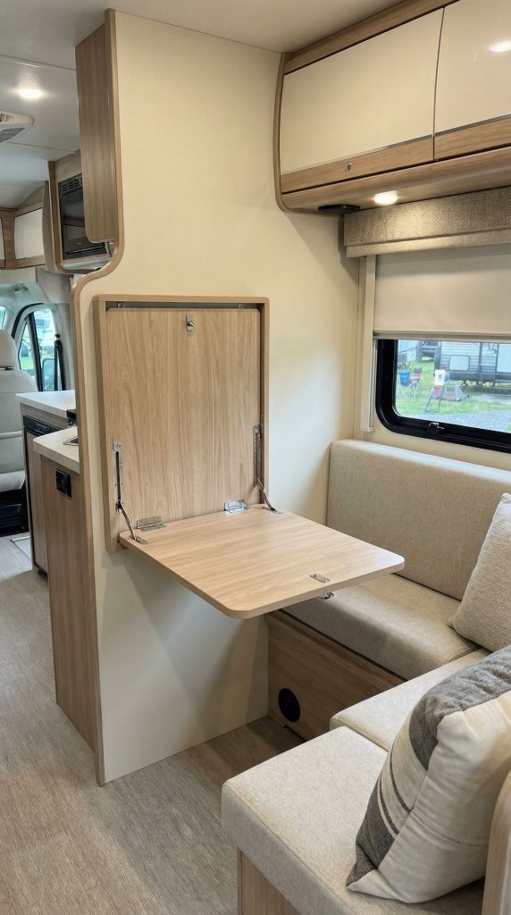 PRO TIP: Add furniture risers or leg extenders to existing furniture pieces to create additional under-furniture storage space. This simple modification provides hidden storage for flat items without changing your RV’s aesthetic or requiring new furniture.