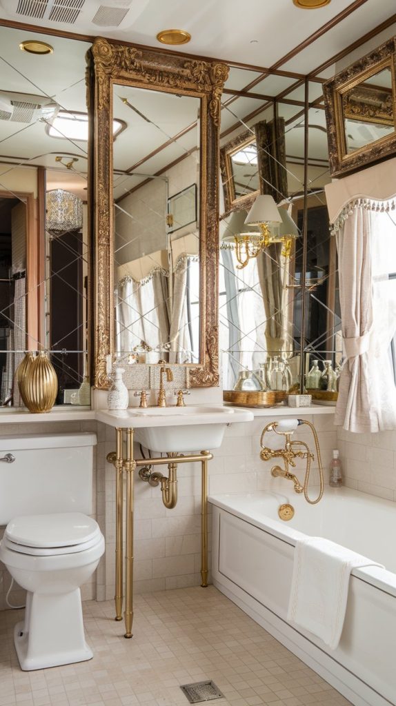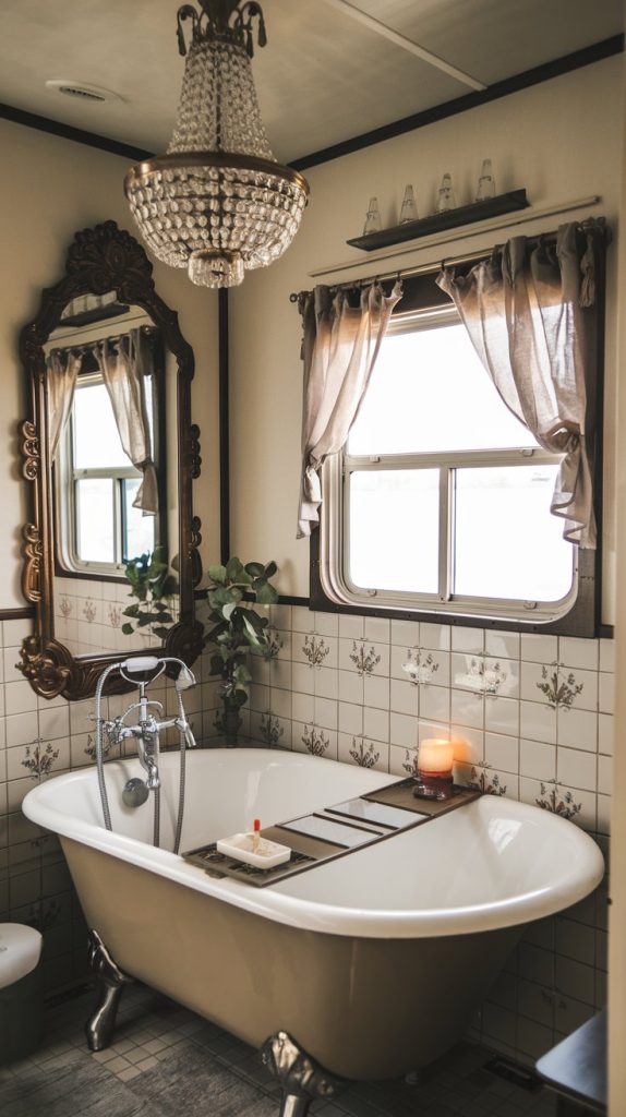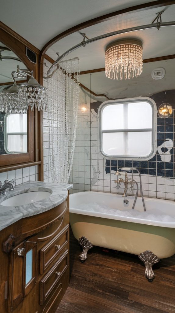 This RV bathroom combines vintage elements with glamorous touches. The clawfoot tub, crystal chandelier, and antique mirror create an elegant and luxurious space. The mix of old and new adds character and charm.