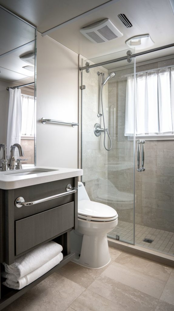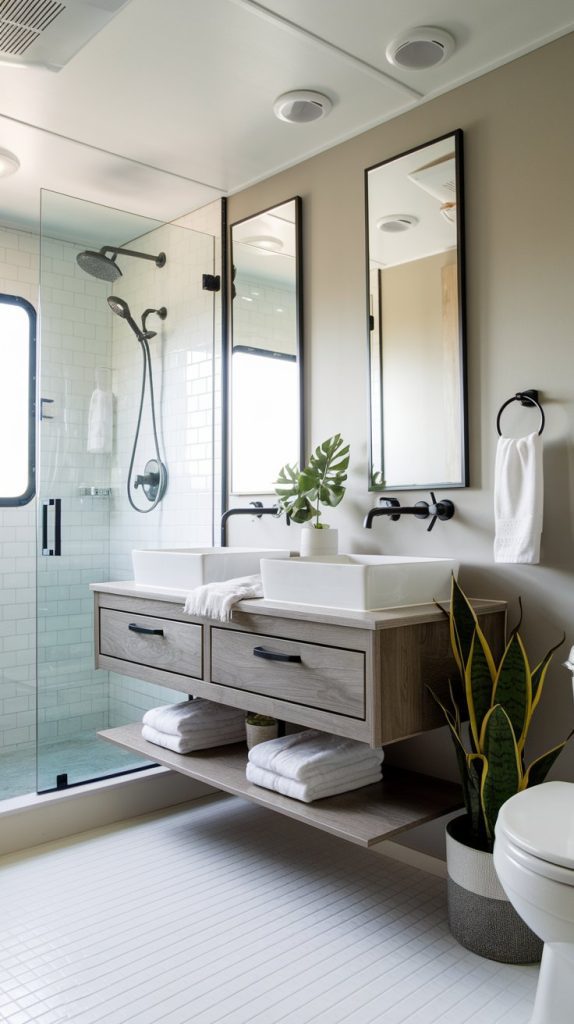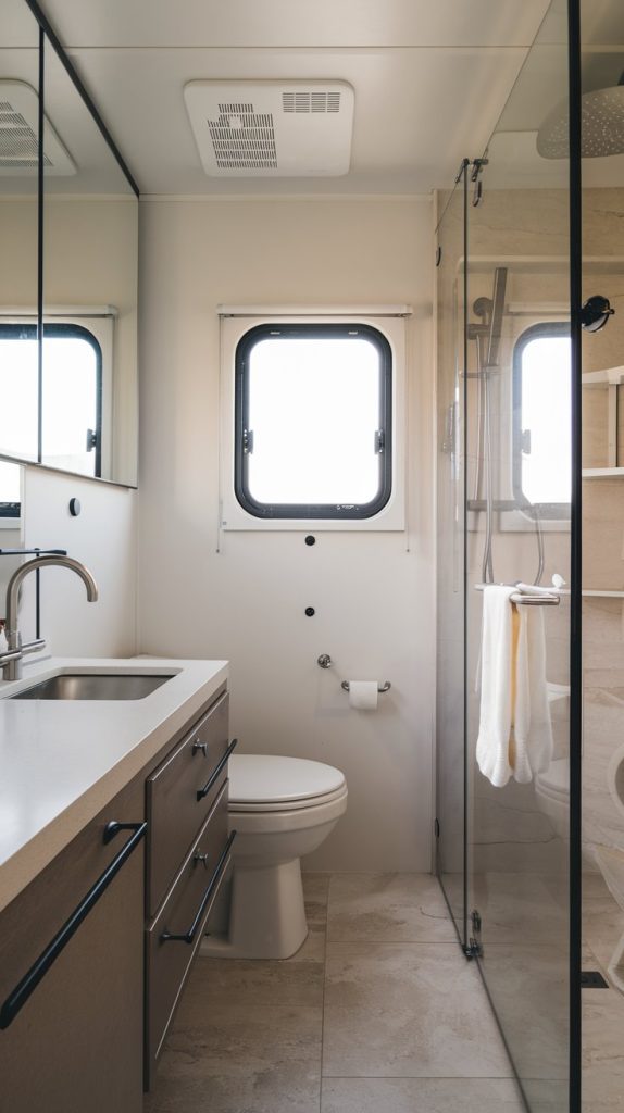 A minimalist design can make a small space feel larger and more serene. This RV bathroom features clean lines, a floating vanity, and a frameless glass shower. The neutral color palette of whites and grays adds to the calming atmosphere.