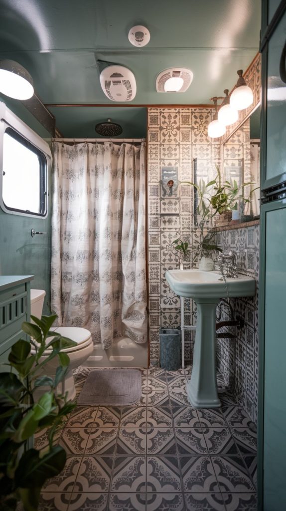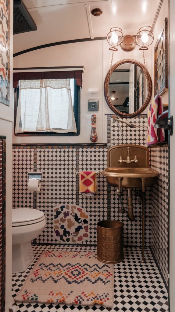A bohemian-inspired RV bathroom is all about eclectic elements and vibrant colors. This design features patterned tiles, a vintage mirror, and colorful accessories. The mix of patterns and textures creates a unique and inviting space.