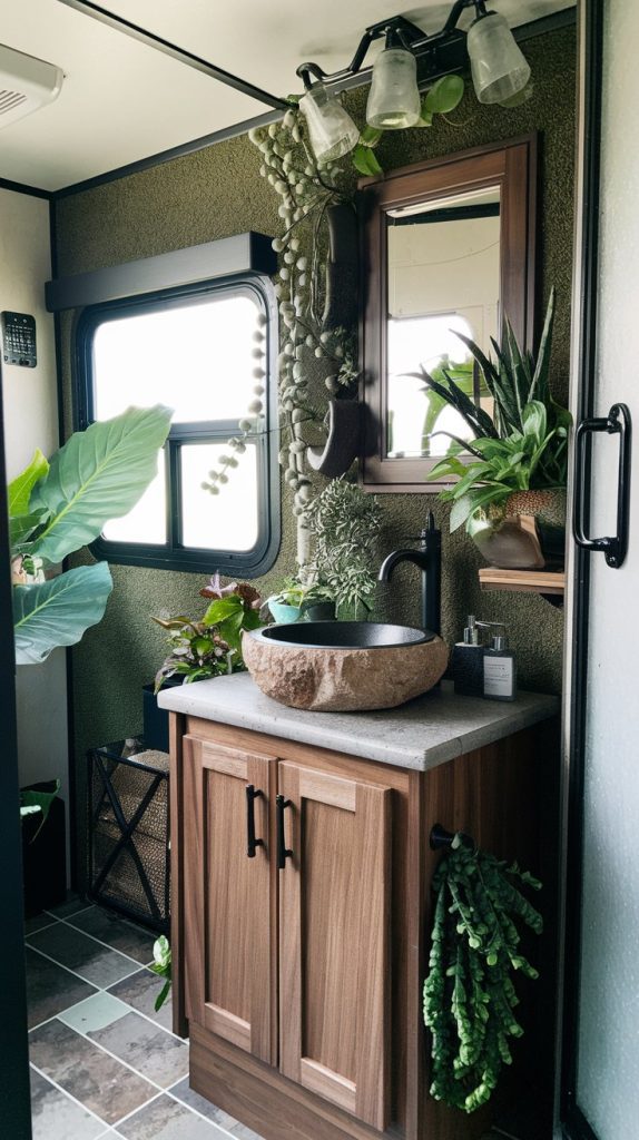 A botanical-inspired RV bathroom features natural elements and greenery. This design includes a wooden vanity, stone sink, and plenty of plants. The lush and vibrant elements create a refreshing and serene space.