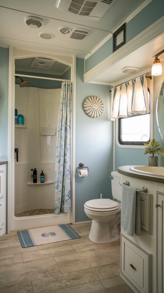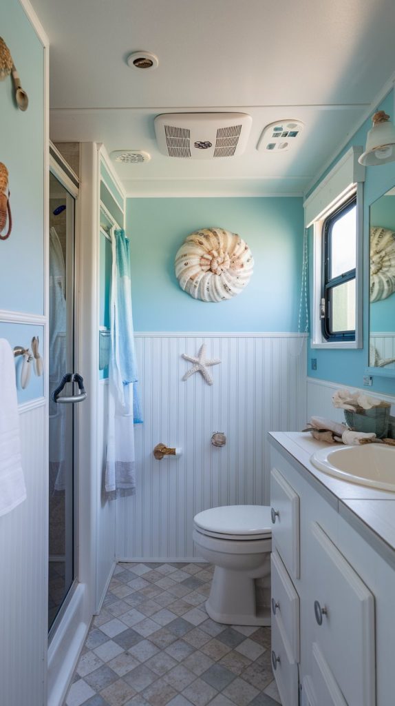 A beach-inspired RV bathroom features coastal elements and light colors. This design includes light blue walls, white accents, and seashell decor. The refreshing and airy elements create a relaxing space.